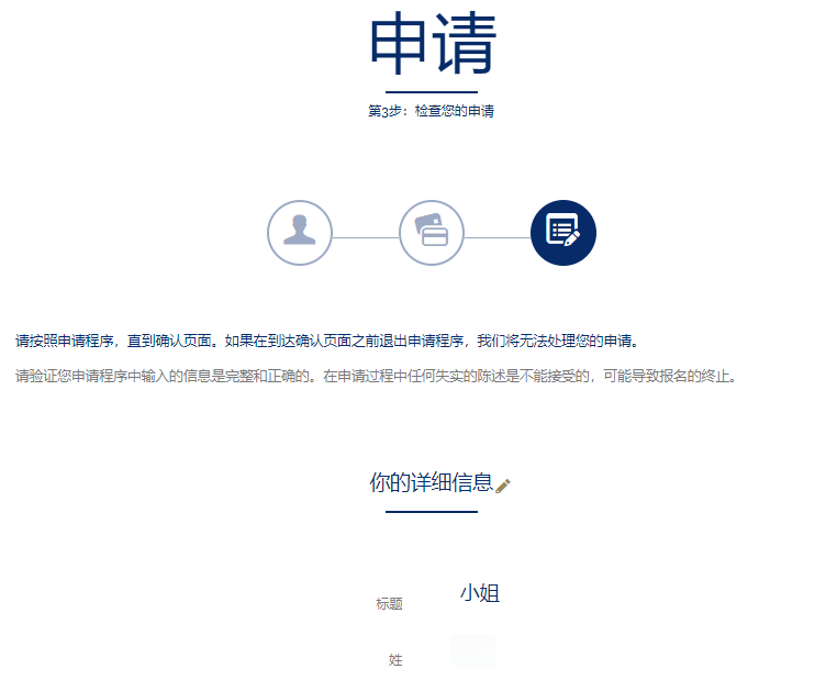6. 自动跳转至“申请”页面,请根据要求依次填写您的个人信息\教育和付款信息\,并根据要求提供相应的电子信息文档。所有信息填写完成后点击“下一个”按钮,进入下一步。